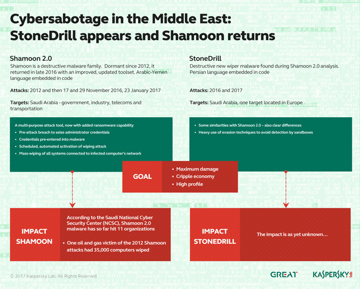 In 2012 Saudi Aramco, the Saudi national oil company got hacked by a disk-wiping malware Shamoon 2 that wiped data from 35,000 computers. A new disk wiper StoneDrill has been unveiled, which is identical to Shamoon 2 malware, striking a European petroleum company.