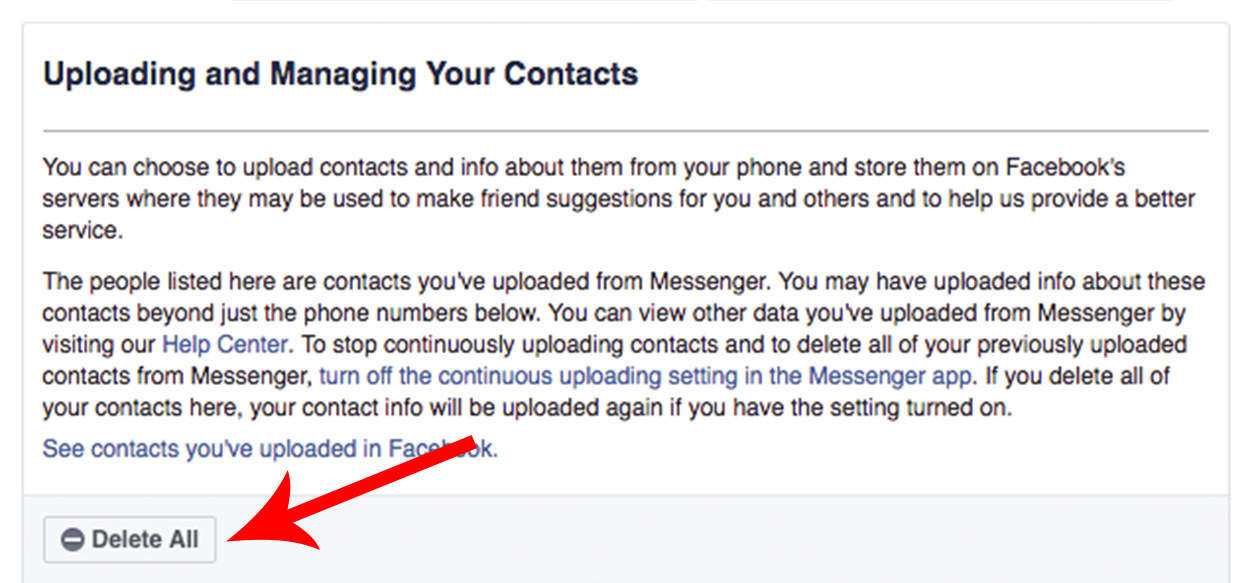 Since you have joined Facebook, there must be hundreds of contacts that could be uploaded, which you can view here. On this page, you can see a “Delete All” option that could be used to clear all the contacts that were previously taken from your account. However, Facebook will update the contacts from your phone’s contact list until you disable contact upload from the settings.