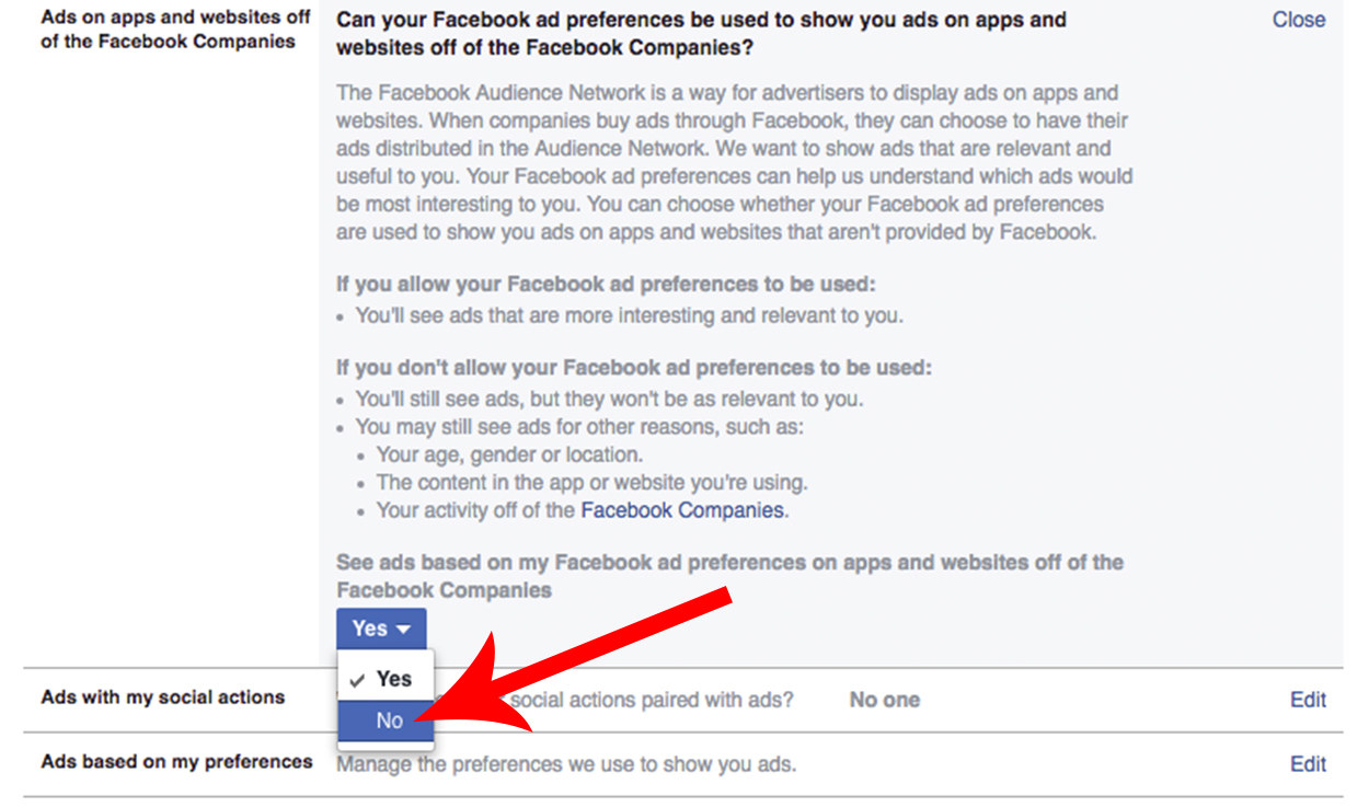 You can change the settings by visiting this page and hitting the “Yes” option at the bottom of the “Ads on apps and websites off of the Facebook” section. Then, select the “No” option to restrict intrusive ads.