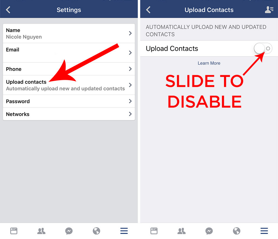 - Finally, go to “Upload contacts” and disable it.